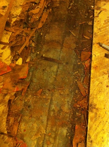 Well – SURPRISE! Under the plywood was another layer of pink laminate tile. And under that? THE ORIGINAL HARDWOOD FLOORS!