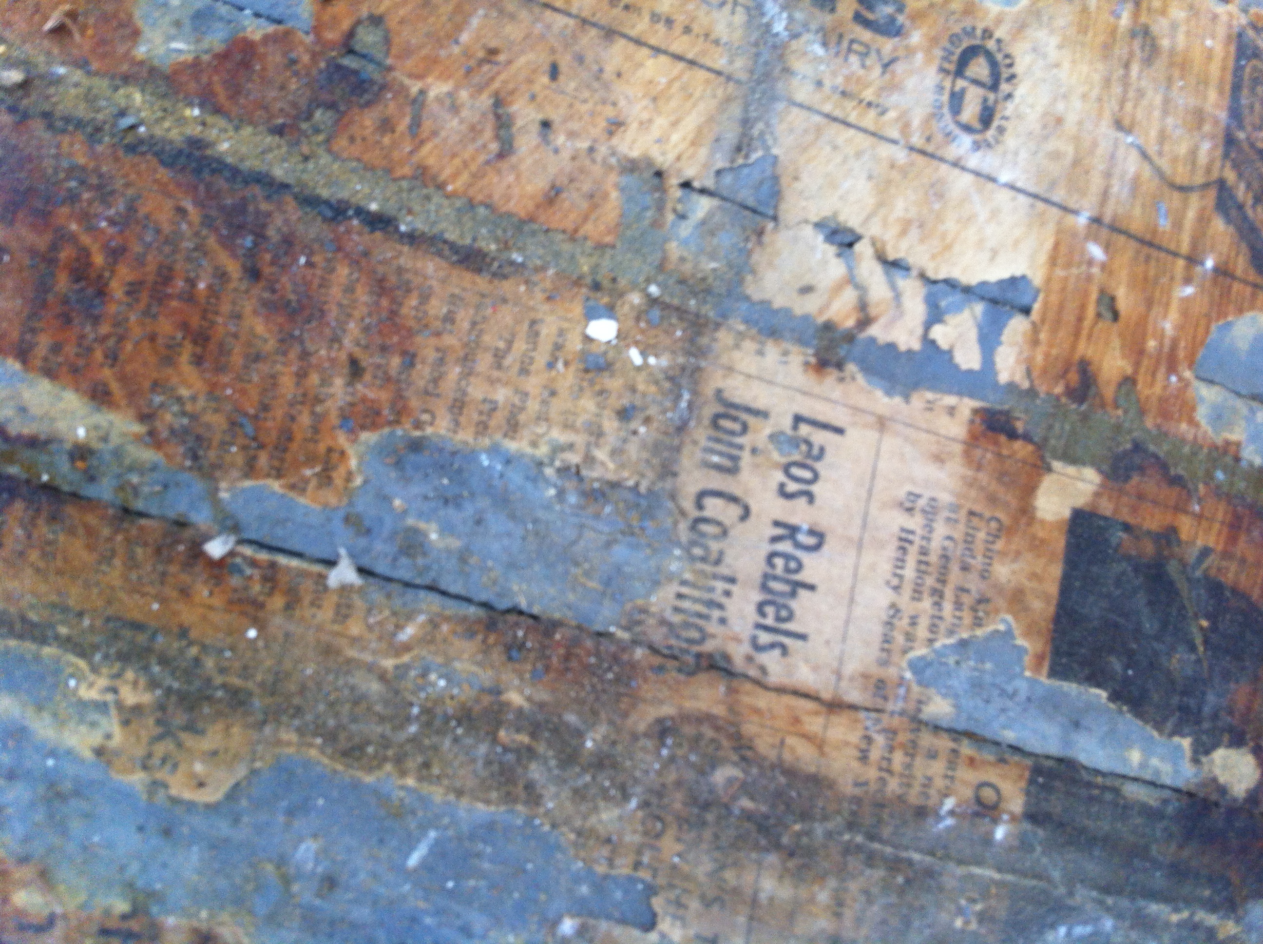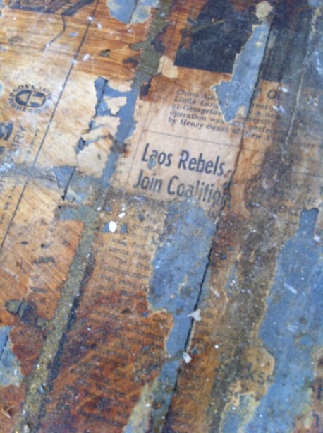What was most surprising, however, was what the previous owners used as a base before laying the plywood down. The streaks of light brown paper is actually pages from the Washington Post – from the 1970s! Here is a close up on a section featuring the Laotian uprising:
