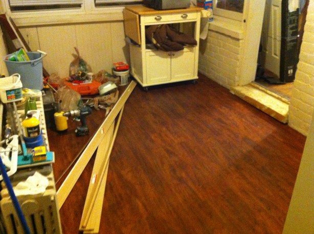 Given my druthers, I’ll eventually take this out and refinish the original flooring. And still plan to preserve at least some of the newspaper clippings. But until then, pergo flooring just made a lot more sense given the traffic this room will see.