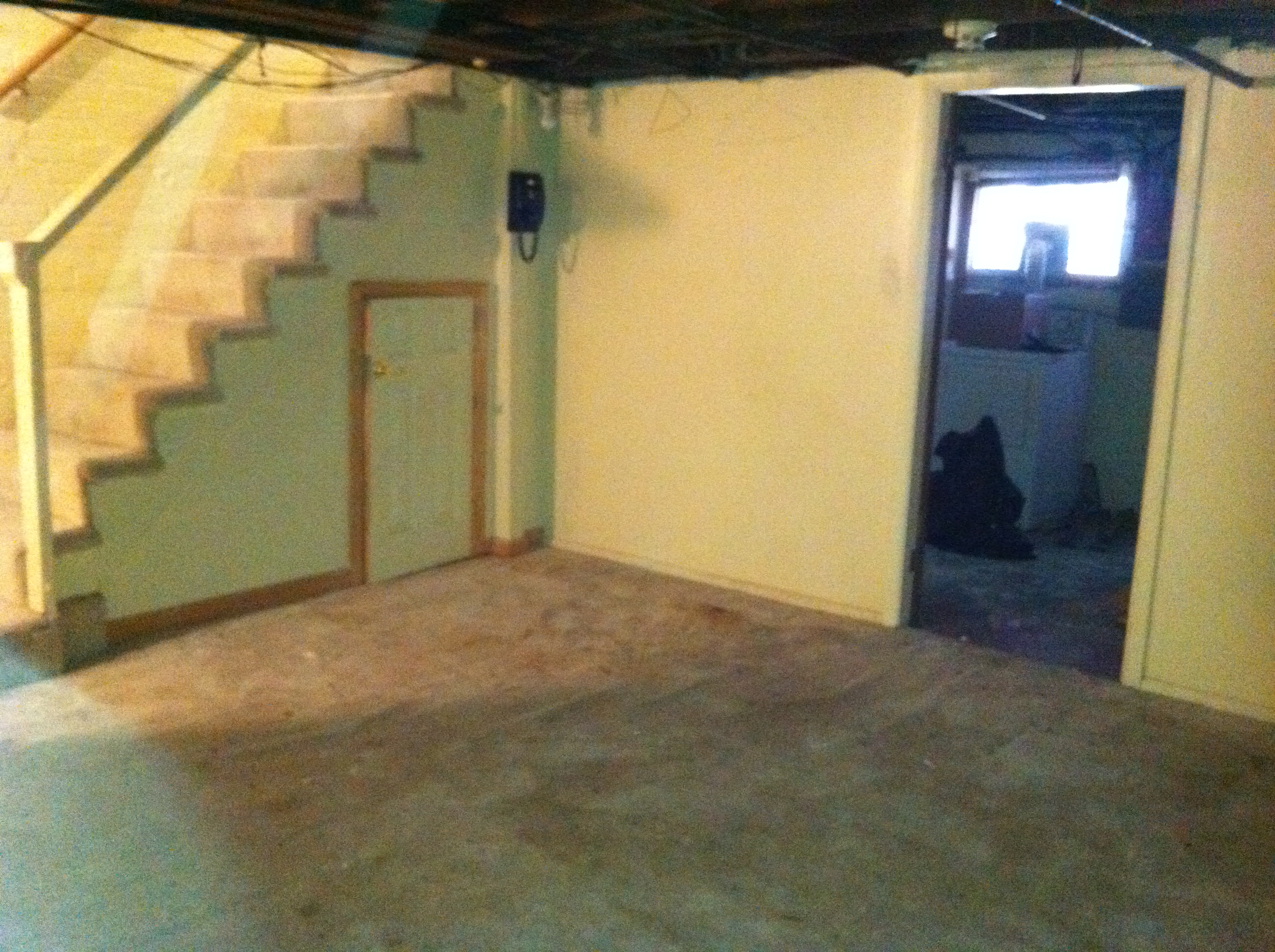 With so many other things in the house needing more immediate attention (READ: I had to sleep in the dining room for a week until the floors upstairs were done!) We moved everything into the basement and started working on the house from the top down. The Mancave had a dividing wall between the finished/carpeted “living area” and the washer and dryer room. Here is a shot from April 2012: