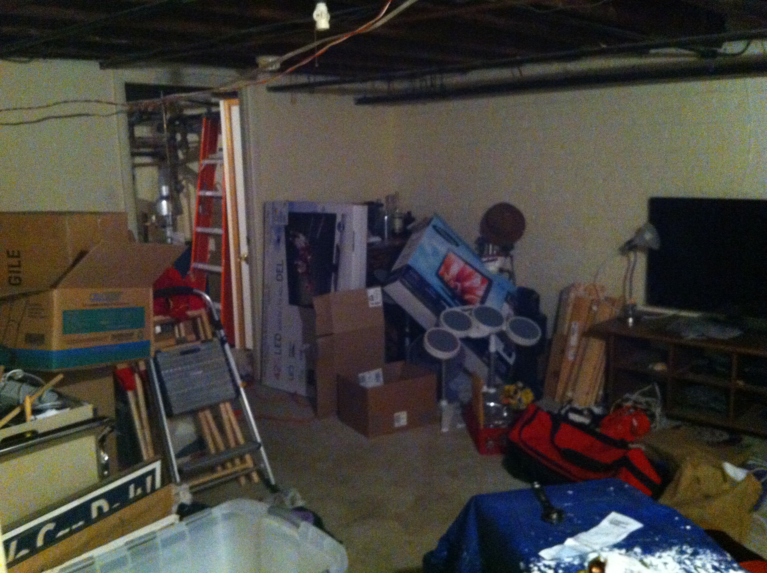 L’Histoire de Mancave. Chapter 1. During the house inspection, it was quickly made evident that the previous owner was a bit of a hoarder. It was packed with boxes and clothes hanging from the exposed pipes. Wading through the basement was akin to walking through Prof. Kirke’s wardrobe, I was half expecting to bump into Mr. Tumnus when I got out on the other side! We had to delay in signing the contract TWICE because it took them so long to clear it out. But finally, closing day came and here’s a look at the basement before I moved in from January 2012: