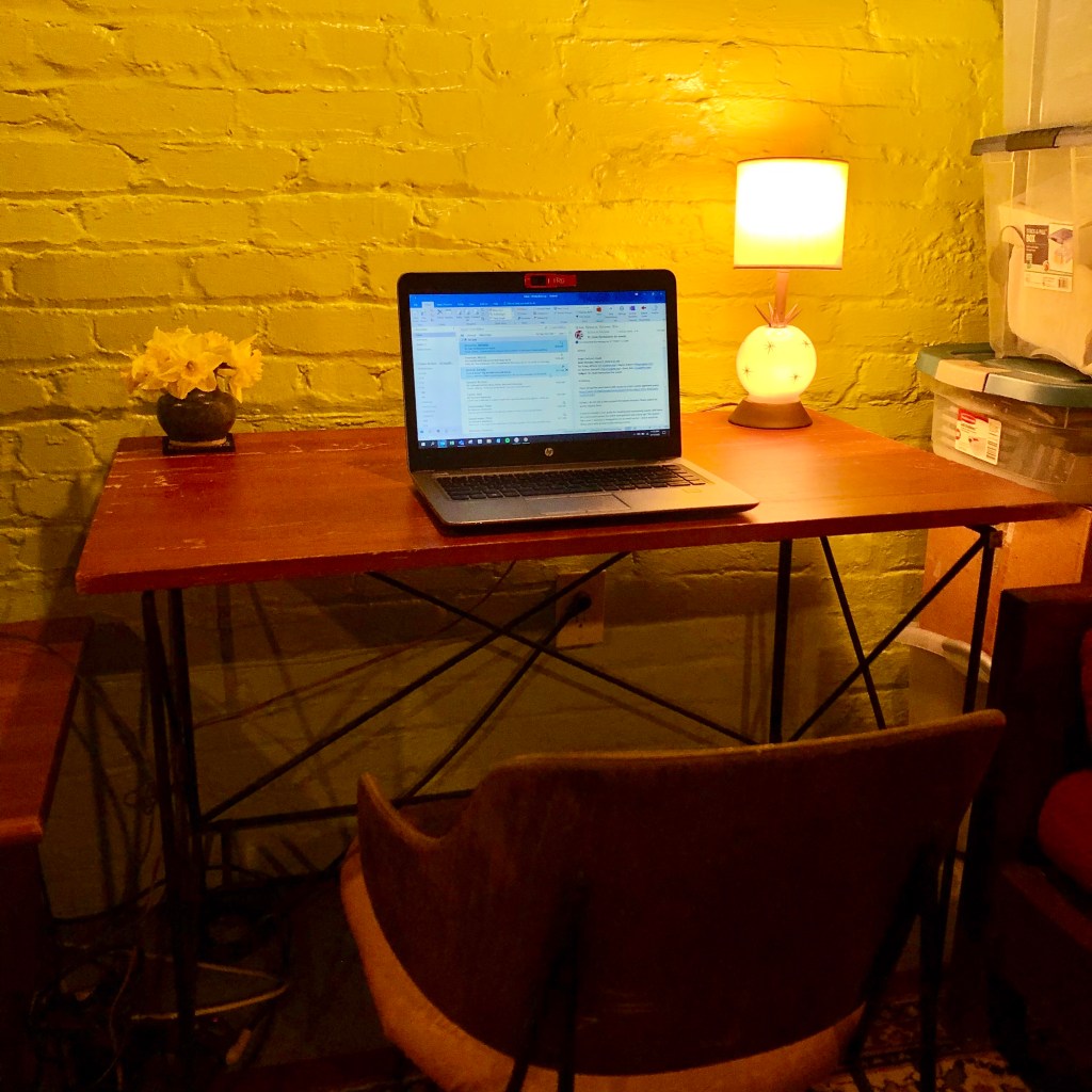 Now that we’re in the time of coronavirus, I needed a new work area where I could plug in my laptop and take work calls 5-7 hours a day. And I immediate thought of that trusty sewing table, gathering dust, just tucked away, waiting for some love and attention.