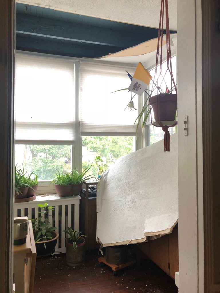 So remember when I said I had a ceiling incident? Let me take you back. Picture it. Washington, DC, September 2018, I’m on my way to work and I come downstairs and find mom eating breakfast…with the ceiling collapsed behind her in the sunroom on the main floor.